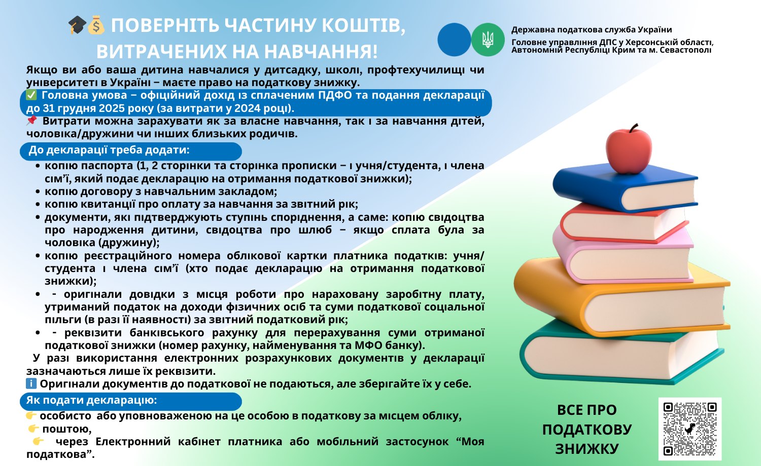 Якщо ви або ваша дитина навчалися у дитсадку, школі, профтехучилищі чи університеті в Україні – маєте право на податкову знижку.