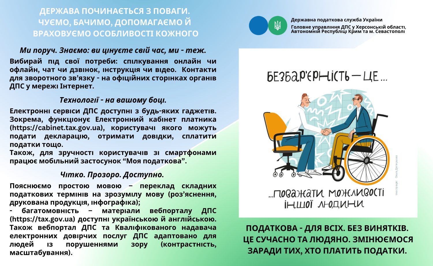 - багатомовність – матеріали вебпорталу ДПС (https://tax.gov.ua) доступні українською й англійською. Також вебпортал ДПС та Кваліфікованого надавача електронних довірчих послуг ДПС адаптовано для людей із порушеннями зору (контрастність, масштабування).