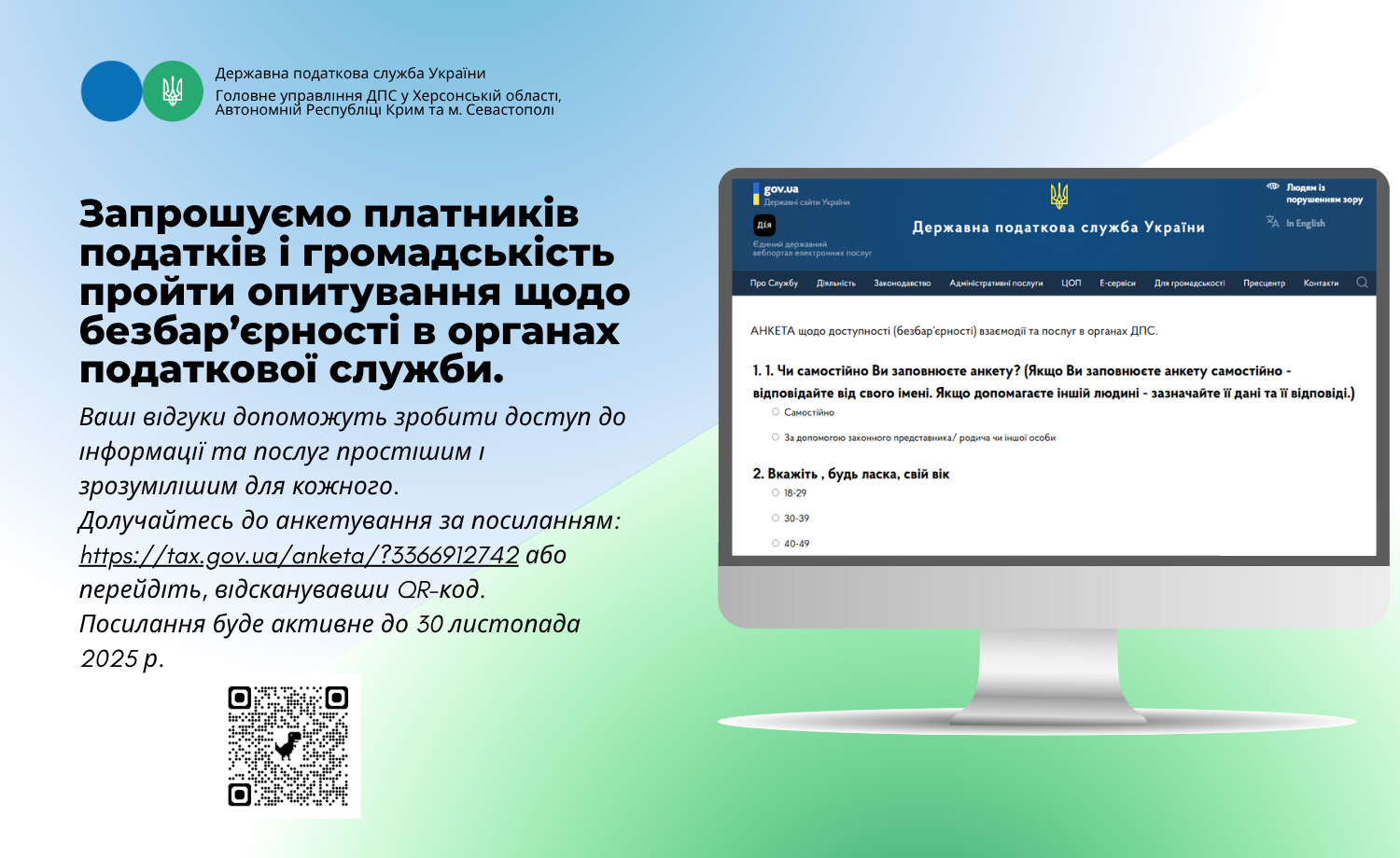 Головне управління ДПС у Херсонській області, Автономній Республіці Крим та м. Севастополі запрошує платників податків і громадськість долучитись до опитування щодо фізичної, інформаційної та цифрової доступності взаємодії та послуг в органах податкової служби.