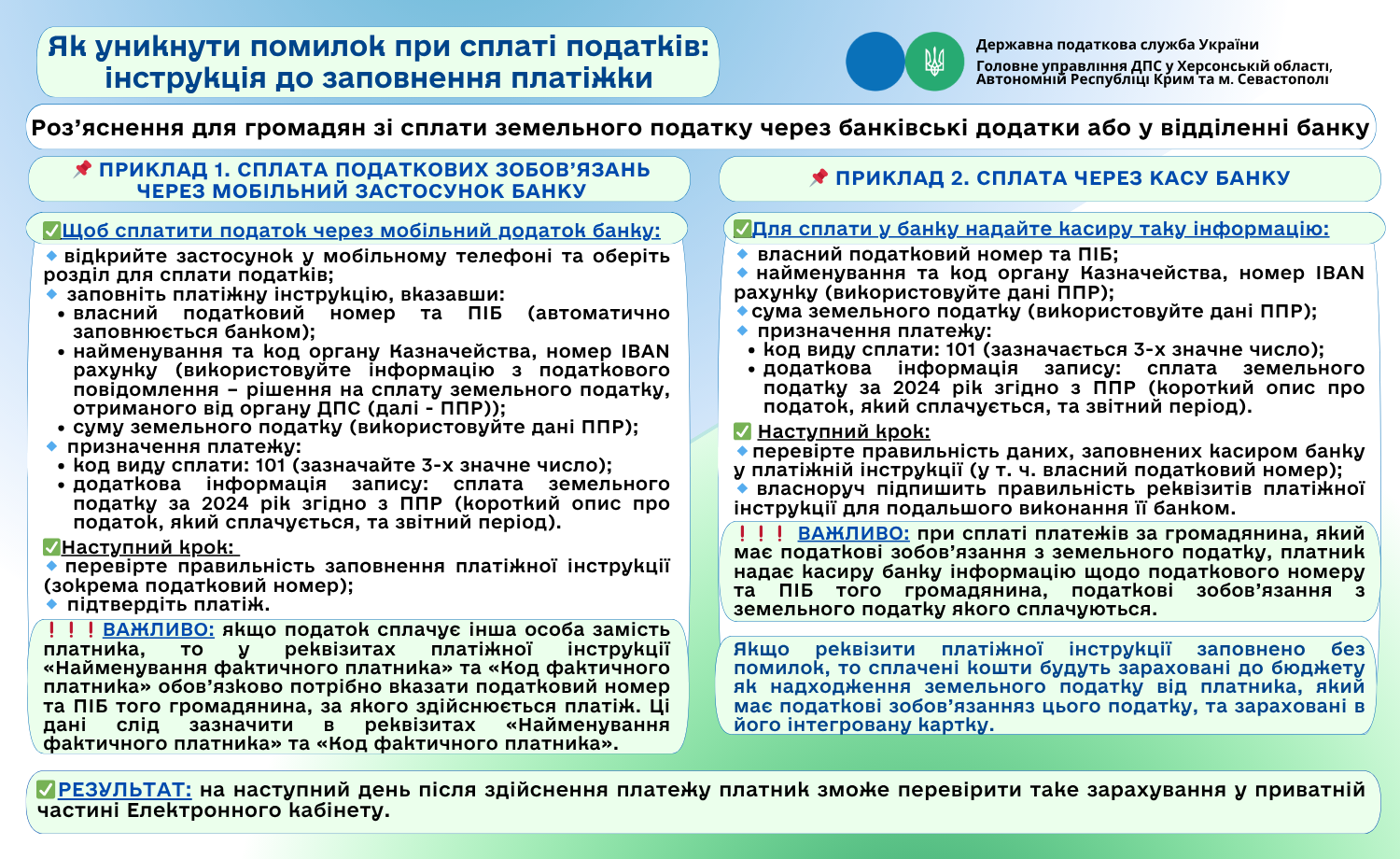 ВАЖЛИВО: при сплаті платежів за громадянина, який має податкові зобов’язання з земельного податку, платник надає касиру банку інформацію щодо податкового номеру та ПІБ того громадянина, податкові зобов’язання з земельного податку якого сплачуються.