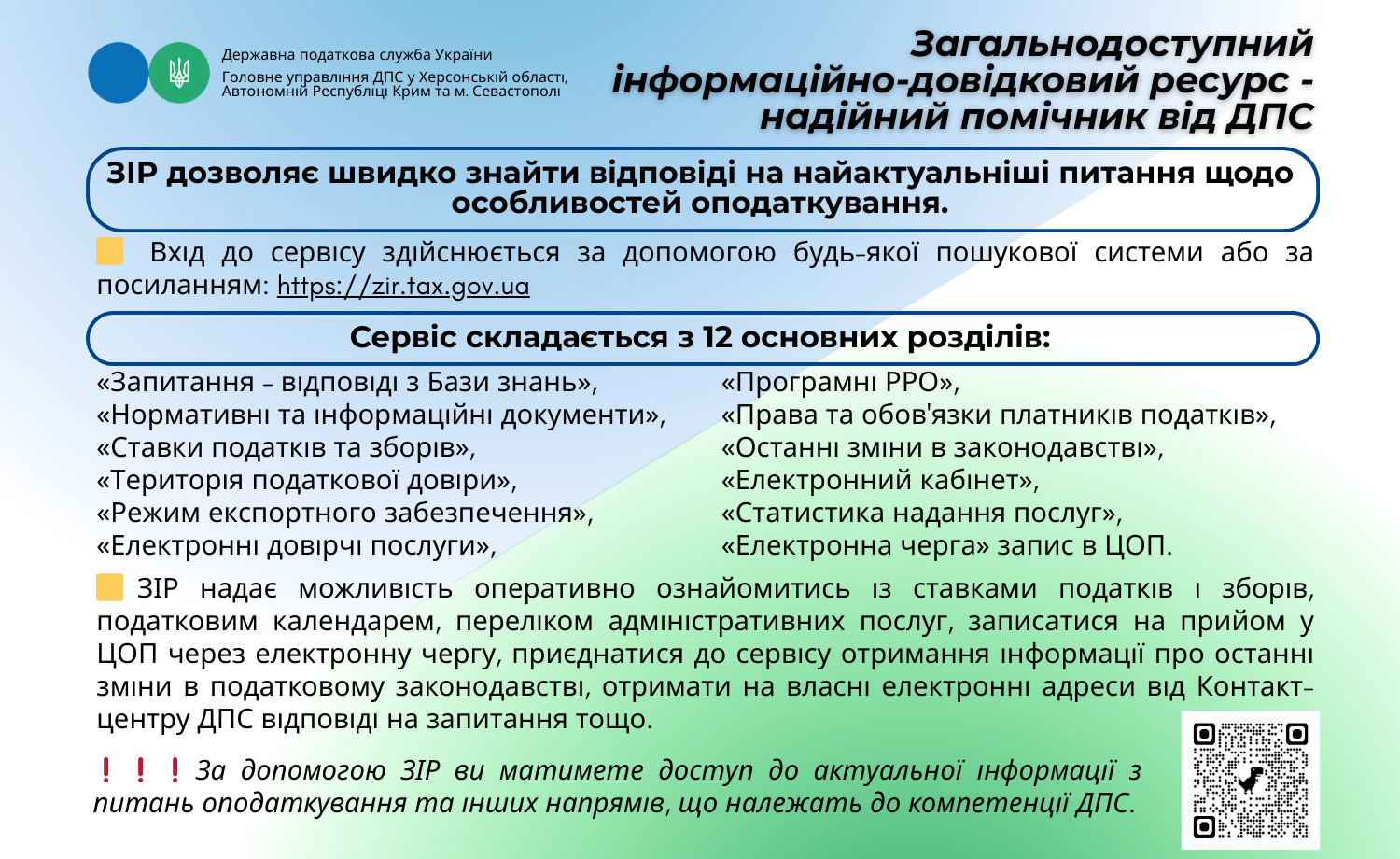 Загальнодоступний інформаційно-довідковий ресурс ДПС (далі – ЗІР) дозволяє швидко знайти відповіді на найактуальніші питання щодо особливостей оподаткування.