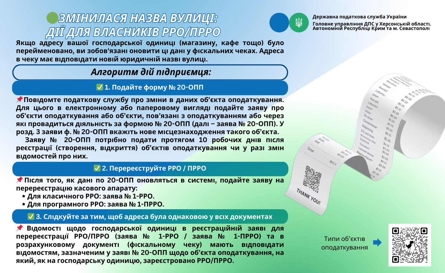 Після перейменування вулиці, суб’єкти господарювання зобов’язані в розрахункових документах (фіскальних чеках) вказувати адресу господарської одиниці, яка є юридично визнаною, і така адреса має кореспондуватись із відомостями, що містяться у документі на право власності / користування господарською одиницею, з урахуванням нормативно-правових актів щодо перейменування назв географічних об’єктів.