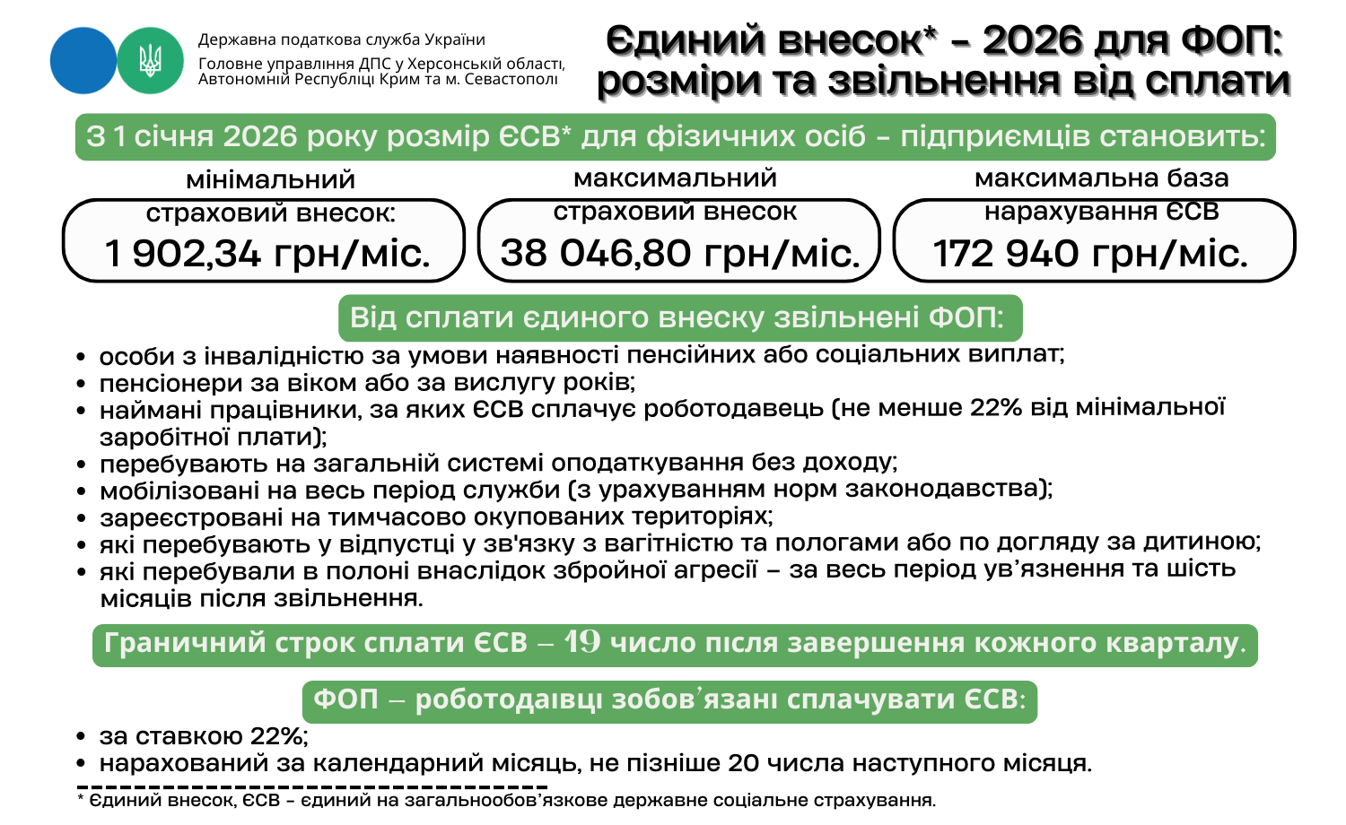 Фізичні особи – підприємці на спрощеній і загальній системах оподаткування, а також самозайняті особи сплачують єдиний внесок за себе відповідно до законів України від 08.07.2010 № 2464-VI «Про збір та облік єдиного внеску на загальнообов'язкове державне соціальне страхування» та 03.12.2025 № 4695-IX «Про Державний бюджет на 2026 рік».