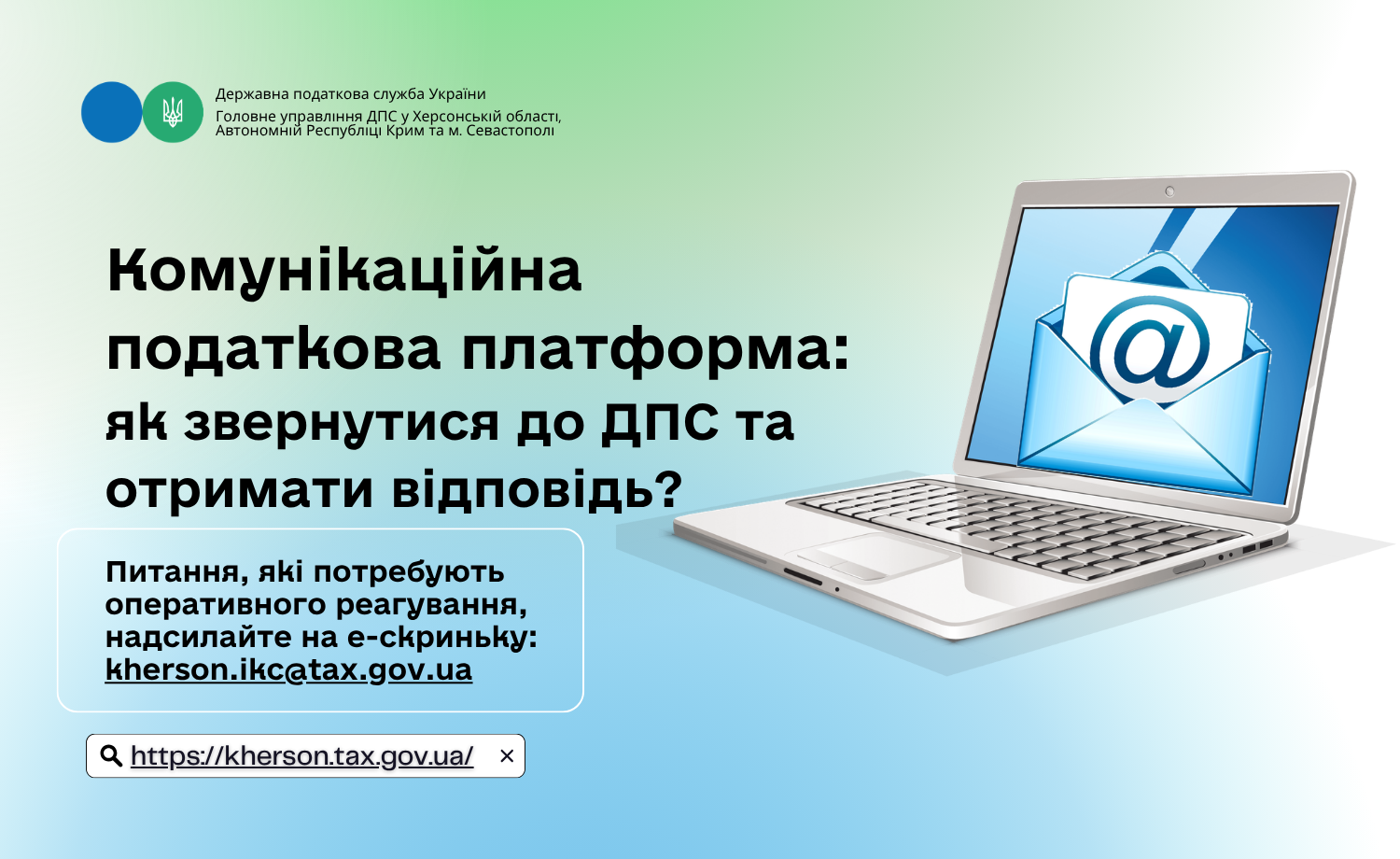Головне управління ДПС у Херсонській області, Автономній Республіці Крим та м. Севастополі нагадує про роботу Комунікаційної податкової платформи. Мета цього проєкту - ефективний діалог інститутів громадянського суспільства та бізнес-асоціацій, що представляють інтереси платників податків, з ДПС та її територіальними органами для оперативного вирішення питань у сфері оподаткування.