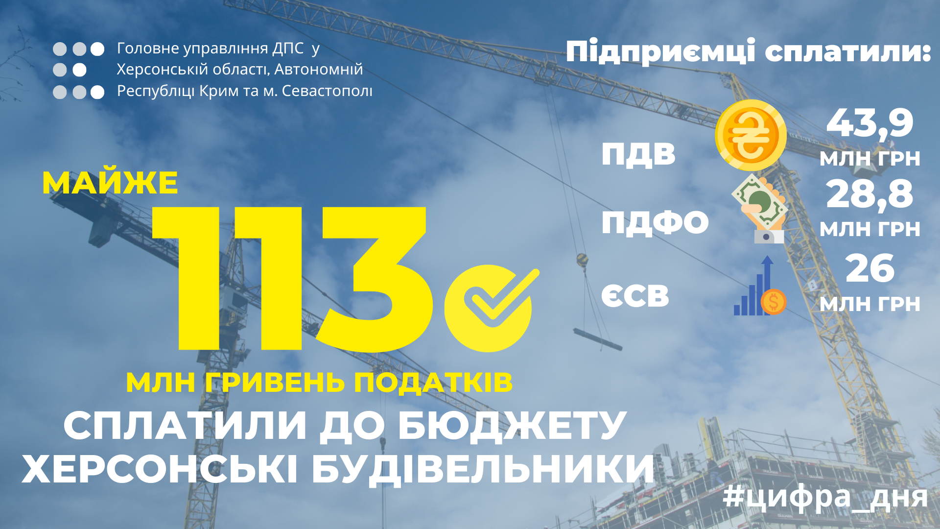 Підприємства будівельної галузі Херсонщини у першому півріччі 2020 року сплатили 112,8 млн гривень податкових платежів. Це на 7,4 млн гривень або на 7 відсотків більше, ніж торік. Питома вага будівельної галузі в загальному зборі платежів до Зведеного бюджету України складає 2,8 відсотки. Таку статистику повідомили спеціалісти управління податкового моніторингу Головного управління ДПС у Херсонській області, Автономній Республіці Крим та м. Севастополі.