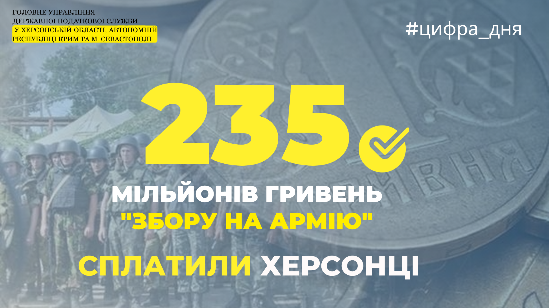 За 9 місяців 2020 року платники податків Херсонської області перерахували до державного бюджету на підтримку української армії 234,8 млн гривень військового збору з приростом до минулорічних надходжень 16,3 млн гривень. Інформацію повідомили спеціалісти управління податкового адміністрування Головного управління ДПС у Херсонській області, Автономній Республіці Крим та м. Севастополі.