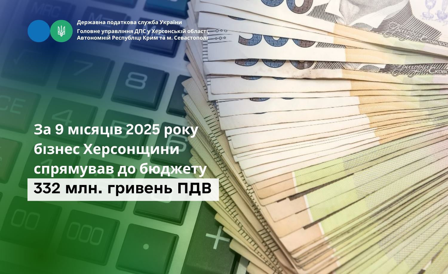 Упродовж трьох кварталів 2025 року суб’єкти господарювання Херсонської області перерахували до державного бюджету 331,9 млн гривень податку на додану вартість.