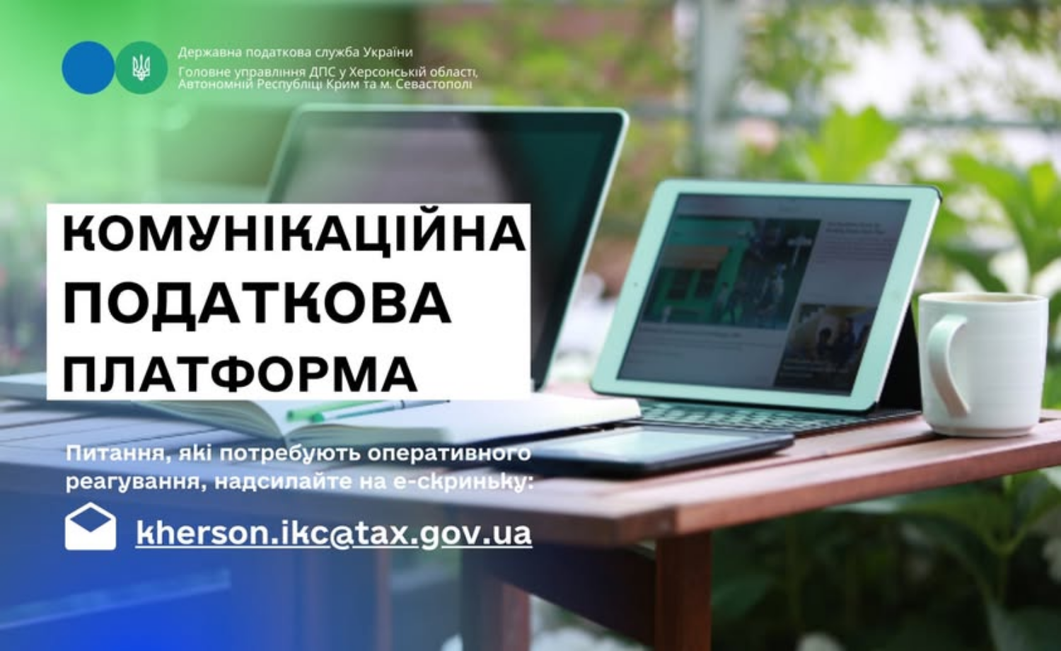 За наявності нагальних питань щодо застосування вимог податкового та іншого законодавства, контроль за дотриманням якого покладено на органи ДПС, чи пропозицій щодо необхідності проведення заходів за визначеною тематикою - звертайтесь на комунікаційну податкову платформу Головного управління ДПС у Херсонській області, Автономній Республіці Крим та м. Севастополі за електронною адресою: kherson.ikc@tax.gov.ua.